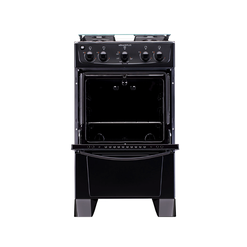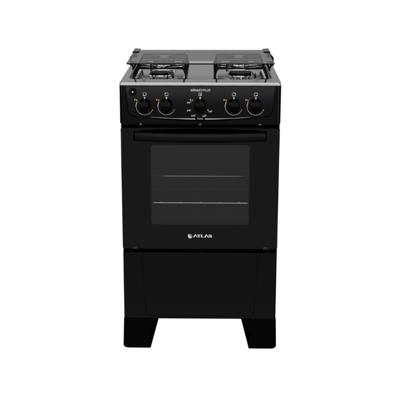 Cocina a Gas Atlas Mónaco Plus, ofrece 4 quemadores de alto rendimiento, un horno espacioso y un elegante acabado en negro, siendo perfecta para quienes buscan una cocina funcional, moderna y eficiente.