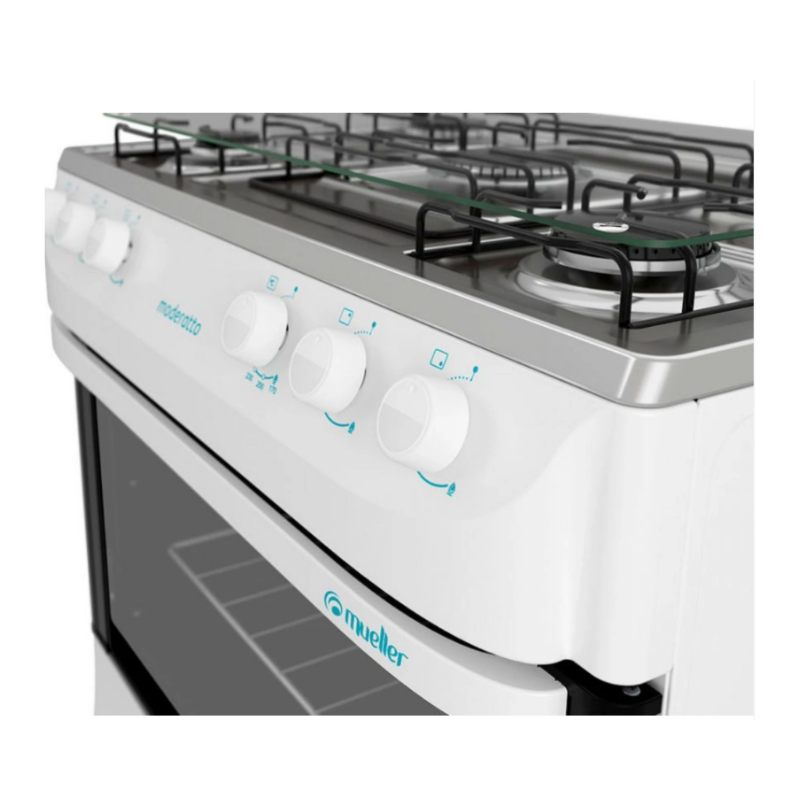 La cocina Mueller Moderatto de 5 hornallas ofrece potencia, practicidad y diseño moderno. Equipada con quemadores eficientes, incluyendo un Ultra Llama ideal para cocciones rápidas, su horno de 82 litros con visor panorámico permite preparar grandes comidas sin perder control. Su tapa de vidrio templado, botones desmontables y rejillas esmaltadas facilitan la limpieza. Con eficiencia energética clase A, es perfecta para el uso familiar diario y compatible con gas GLP o natural.