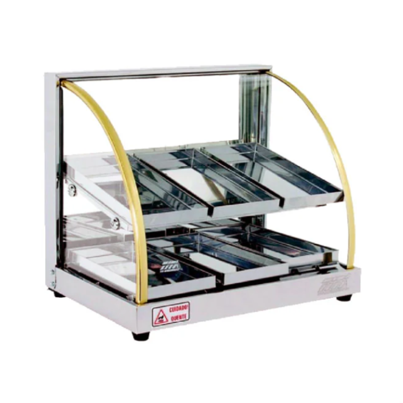 La Estufa para Alimentos Tita 06 Band Doble Sin Luz Eco es un exhibidor térmico profesional pensado para mantener calientes y listos tus productos alimenticios sin luz interna, lo que permite una mayor eficiencia energética y reducción de consumo eléctrico. Con doble cámara y 6 bandejas, ofrece una excelente capacidad para exhibir y conservar empanadas, snacks, salchichas, panes, sándwiches o similares, manteniendo su temperatura ideal en cafeterías, rotiserías, panaderías y puntos de venta. El diseño en acero inoxidable y vidrio templado facilita la limpieza y presenta los alimentos de forma atractiva.