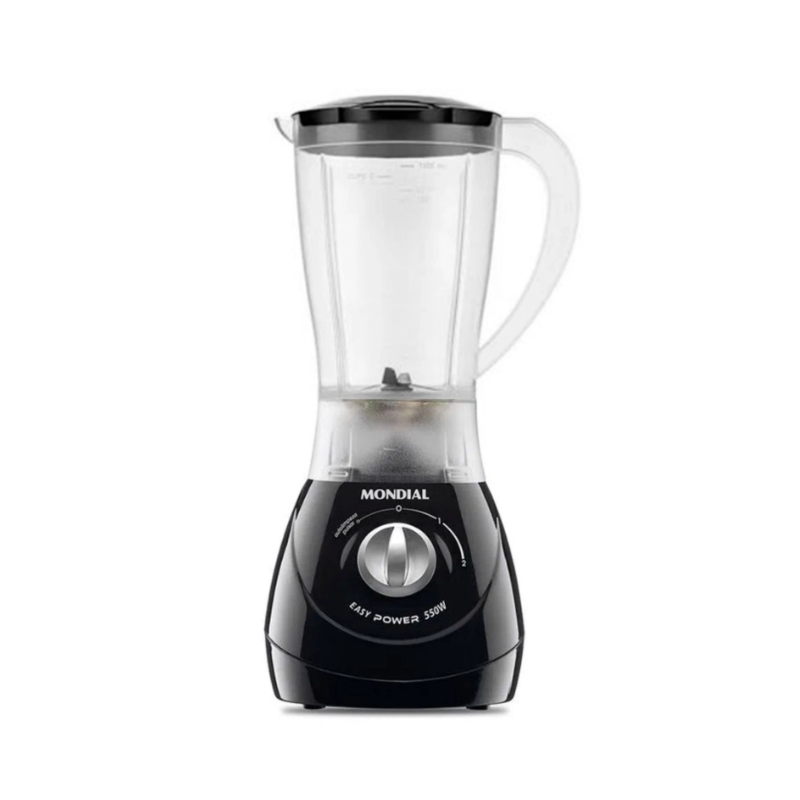 Licuadora Mondial Easy Power L-550-B con potente motor de 550W, 2 velocidades y función pulsar. Vaso resistente de 1.5L, cuchillas de acero y diseño práctico para un licuado eficiente y seguro.