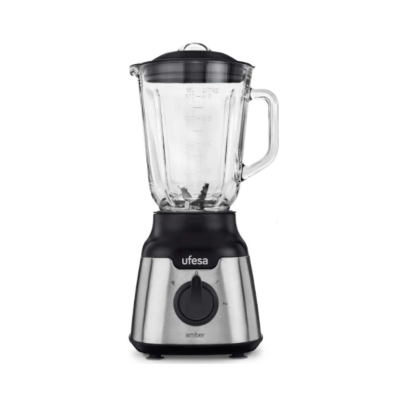 La Ufesa Amber BS4000 900W Batidora de vaso es una licuadora potente y versátil diseñada para uso diario en el hogar, combinando rendimiento, durabilidad y facilidad de uso. Con un motor de 900 W, ofrece la potencia necesaria para licuar, triturar y mezclar una amplia variedad de ingredientes con eficacia, incluidos hielo y frutas más firmes, gracias a sus cuchillas de acero inoxidable de alto rendimiento.